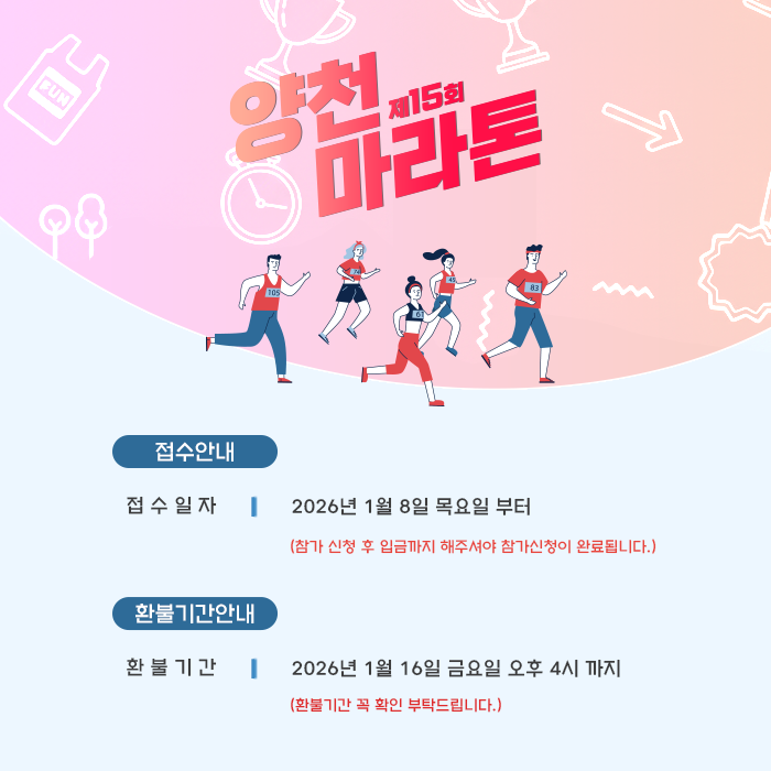 참가신청안내 대회코스 유의사항 찾아오시는 길 환불요청게시판 제15회 양천 마라톤대회 D-DAY : 86일 대회 일시 2026년 4월 11일(토요일) 집결 8:00 , 출발 8:30 대회 종목 하프코스, 10km, 5km, 5km패밀리런 접수 기간 2026년 1월 8일 부터 선착순 5,000명 모집 개인 참가신청 단체 참가신청 패밀리런 참가신청 2025년 대회 영상 보기 하프, 10Km 주자, 오목교 (08:36~08:54) 하프, 10Km 주자, 골인200M 전 (09:10~10:00) 하프, 10Km 주자, 골인200M 전 (10:00~10:55) 마라톤 참가신청 참가확인 및 수정 오늘 이 창 열지않음 닫기